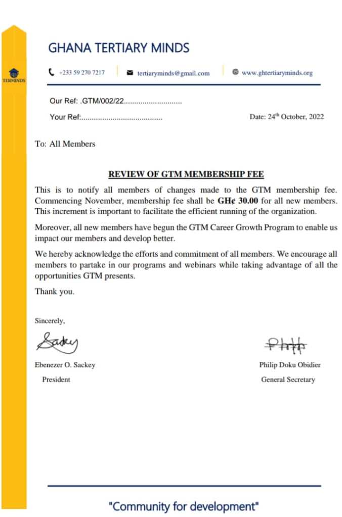 The general public and prospective members of the Ghana Tertiary Minds are by this attached communique informed of changes in the membership registration fee.